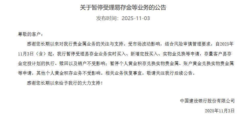 自11月3日(含)起,建行暂停受理易存金业务实时买入、新增定投买入、实物金兑换等申请,存量客户易存金定投计划的执行、赎回以及销户不受影响;暂停个人黄金积存兑换实物贵金属、账户黄金兑换实物贵金属等申请,其他个人黄金积存业务不受影响。