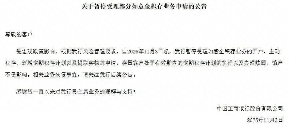 受宏观政策影响,根据风险管理要求,自2025年11月3日起该行暂停受理如意金积存业务的开户、主动积存、新增定期积存计划以及提取实物的申请,存量客户处于有效期内的定期积存计划的执行以及办理赎回、销户不受影响。相关业务恢复事宜,请关注银行后续公告。