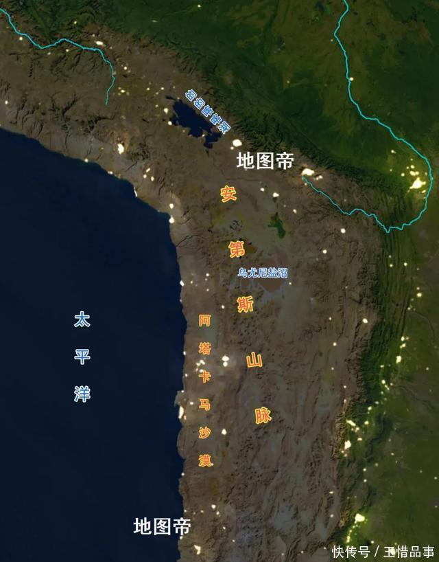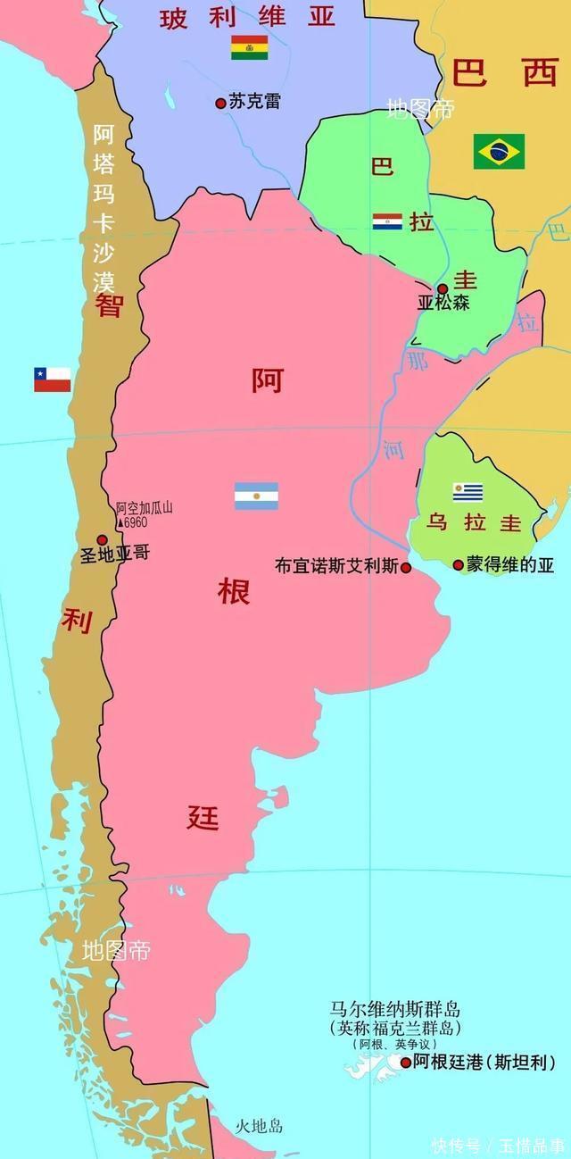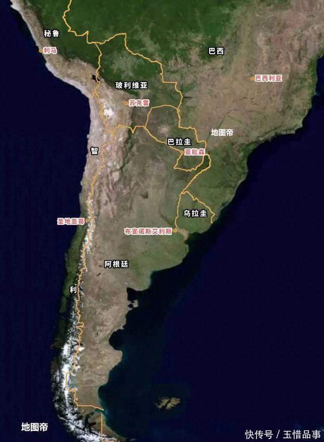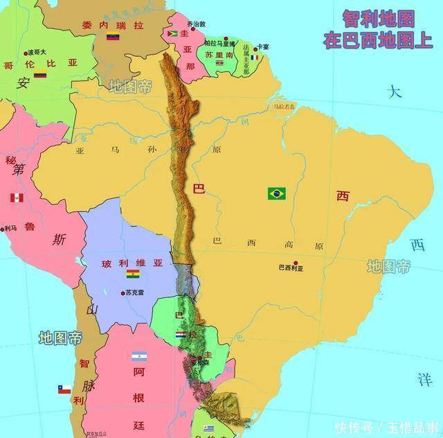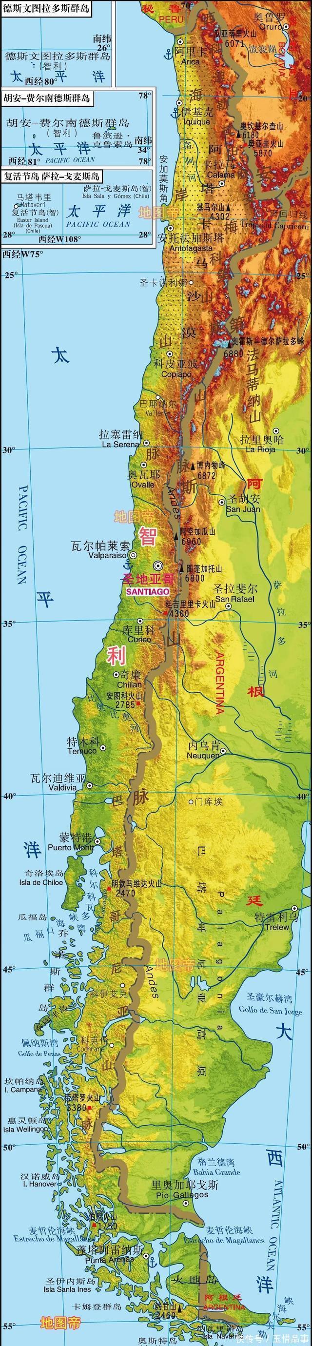 1776年(清高宗乾隆四十一年),从秘鲁总督辖区中分出拉普拉塔总督辖区,从北往南包括今天的玻利维亚、巴拉圭和乌拉圭、阿根廷,首府设在布宜诺斯艾利斯。而秘鲁和智利仍在秘鲁总督辖区,这是以安第斯山脉为界,进行东西分区。智利与阿根廷之间是常年积雪的安第斯山脉,近在身边,远在眼前。       【受阻阿塔卡马沙漠,否则更加狭长】       智利最北边是阿塔卡马沙漠,南北长1600千米,面积约10.47万平方千米,智利占据大部分,与玻利维亚、秘鲁、阿根廷各占极少部分。阿塔卡马沙漠和非洲西南部的纳米布沙漠相似,一个临太平洋,一个临大西洋,都是南北狭长。